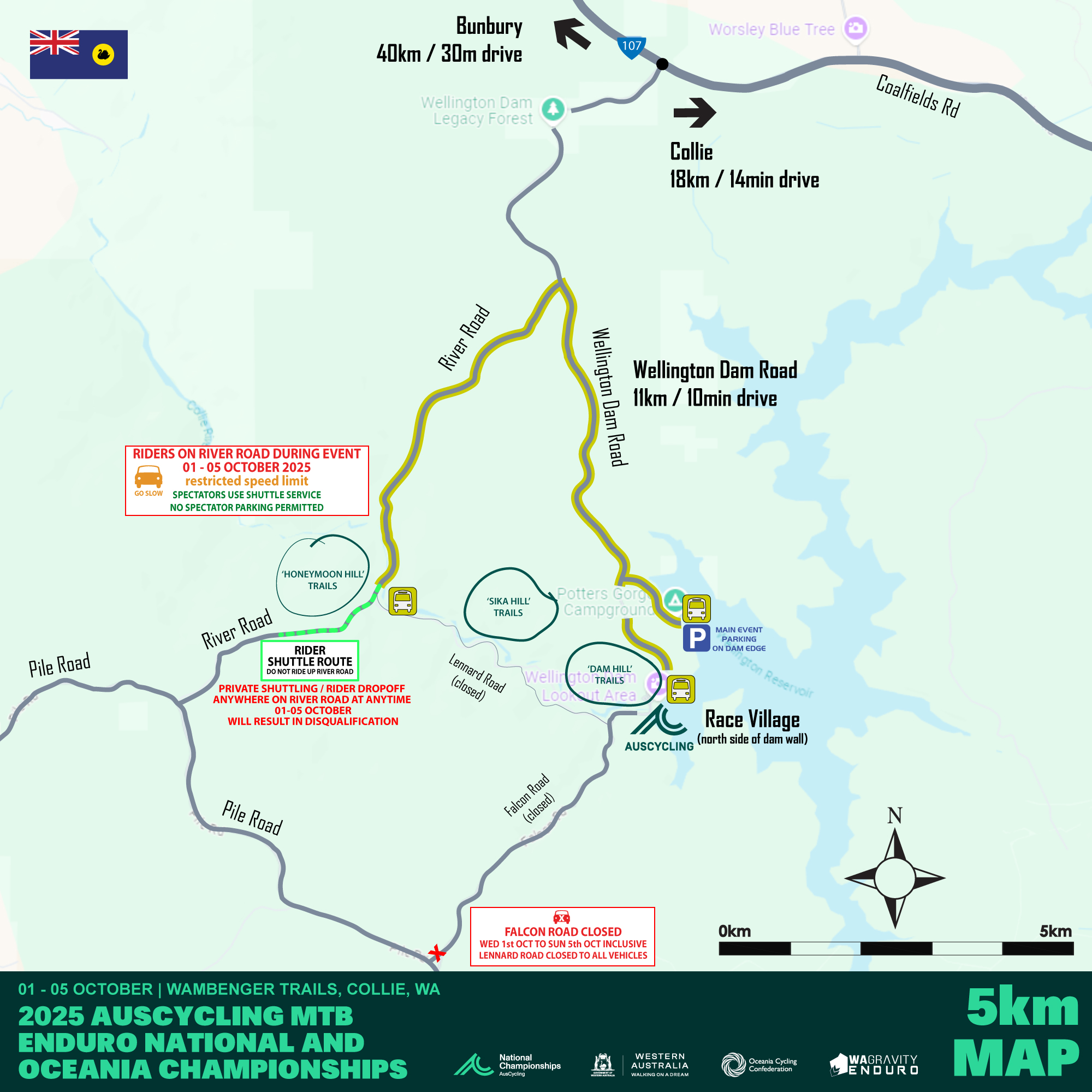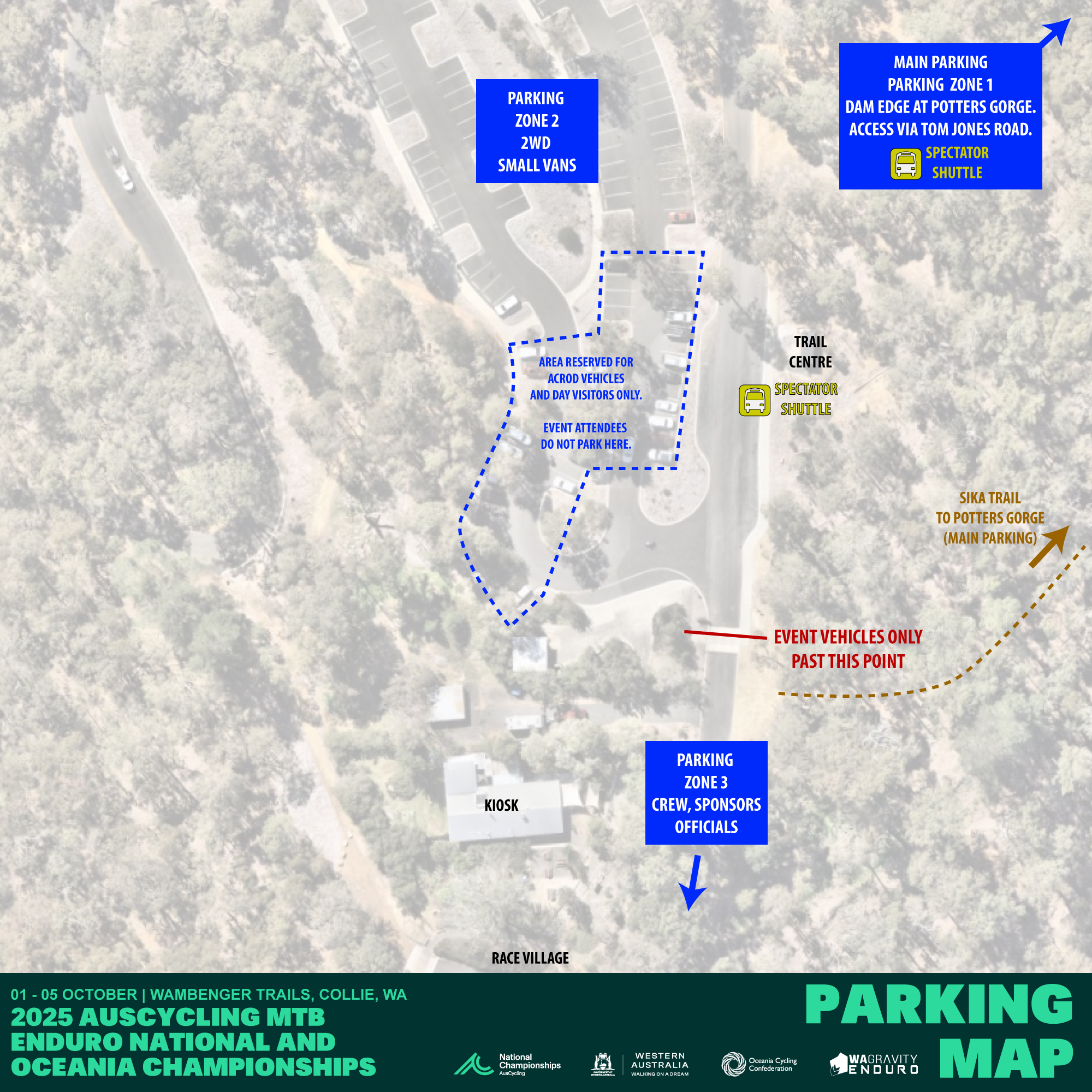 Spectators are welcome to walk up the side of trails but please ensure you are behind course bunting at all times and at least 2m off the trail when riders are descending. Look for Spectator points indicated on the Course Map for viewing opportunities.