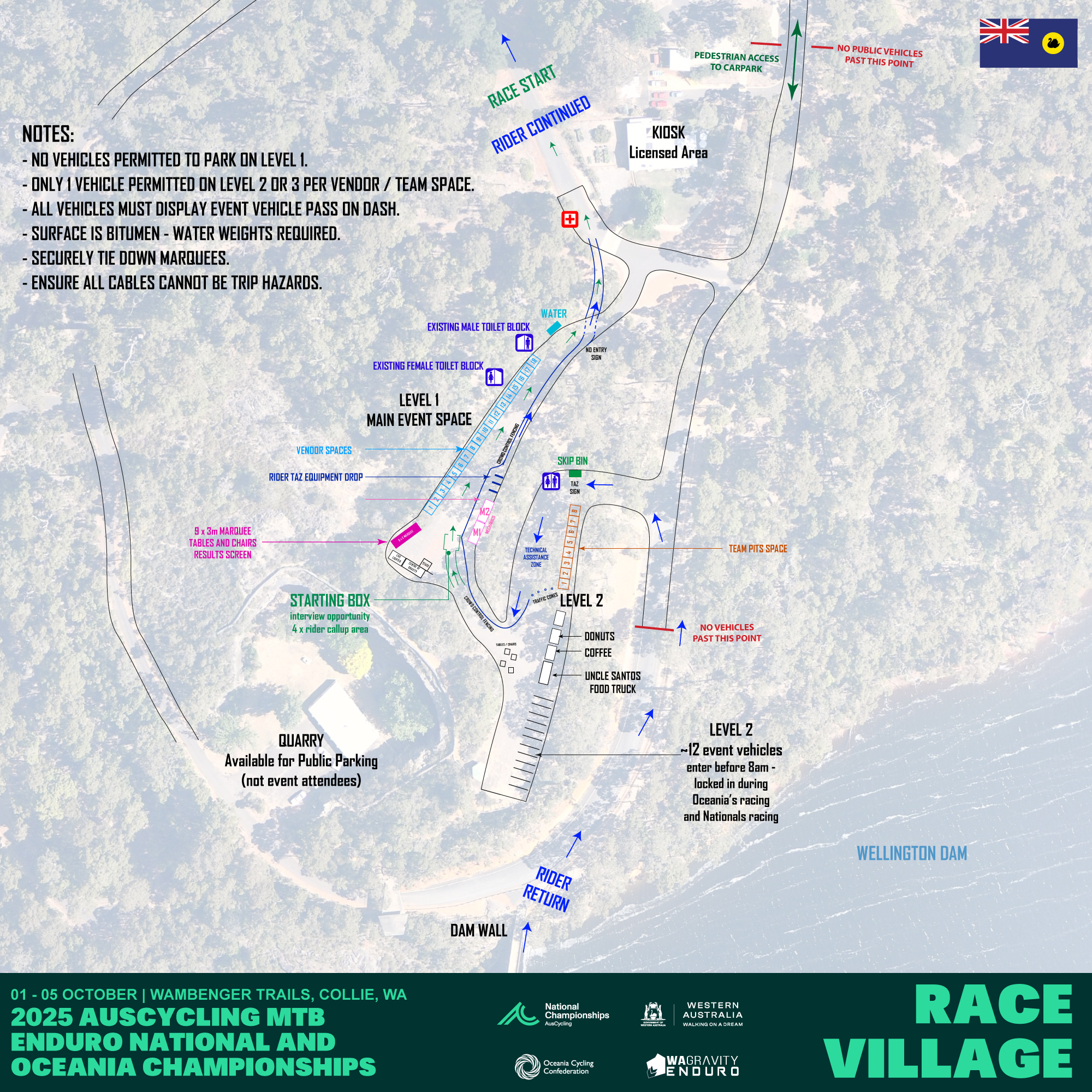 - ONLY event crew, sponsors and guests are permitted to drive into the main gate. As per last year, there is a huge parking area available just a bit further up Lennard Road